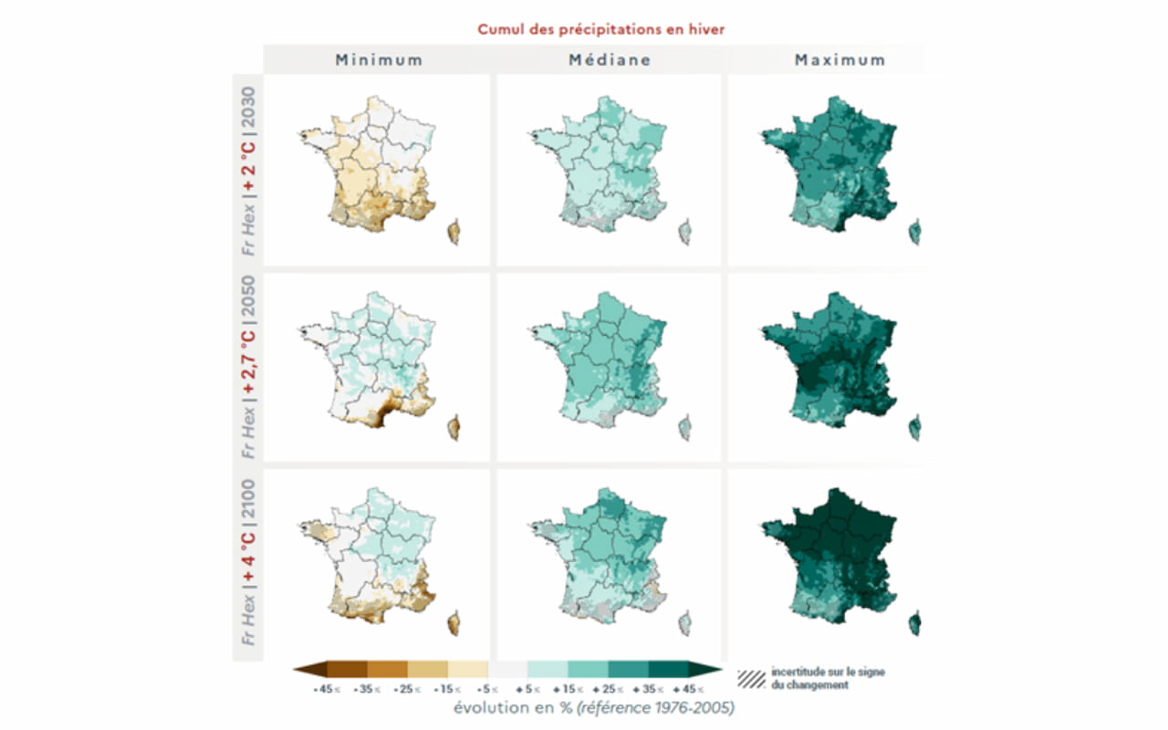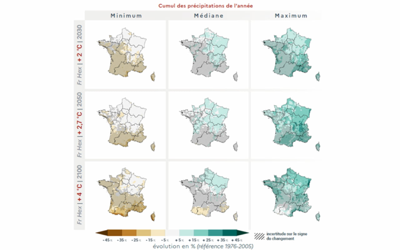 A l’échelle d’une année complète, les simulations projettent une légère augmentation sur le quart nord-est du pays. Météo France ne parvient pas à définir le signe de l’évolution sur le reste de l’hexagone, hormis une légère baisse sur le sud-ouest dans le scénario. Le cumul annuel des précipitations est considéré comme stable. Néanmoins, les précipitations utiles (différence entre précipitations et évaporation) vont diminuer sous l’effet de la hausse des températures et les contrastes saisonniers vont avoir tendance à s’exacerber avec une dominante de hausse en hiver et une baisse en été.