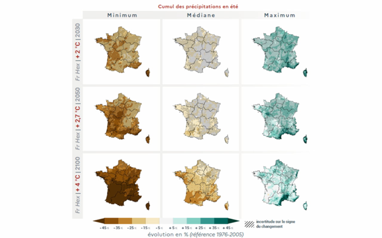 En été, la baisse domine sur tout le pays, avec une valeur moyenne de -20% d’ici la fin du siècle, mais la confiance sur le signe de changement reste limitée pour 2030 et 2050, voire pour le niveau de réchauffement +4°C dans le quart nord-est. Même les Pyrénées-Orientales, qui ont pourtant connu plusieurs années incroyablement sèches, pourraient donc paradoxalement assister à une augmentation des précipitations dans les années à venir.