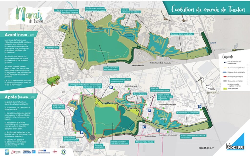 En bordure de la ville de La Rochelle, le marais de Tasdon s’asséchait et se refermait progressivement. 3 ans d’études et 2 années de travaux de très grande ampleur ont permis de recréer sur les 84 hectares un fonctionnement hydraulique adapté et une diversité de milieux doux, saumâtres et salés. Le nouveau milieu naturel, recréé de toutes pièces par l’homme, est désormais propice au retour de la faune, notamment oiseaux migrateurs ou nicheurs, et un lieu de promenade prisé des habitants.