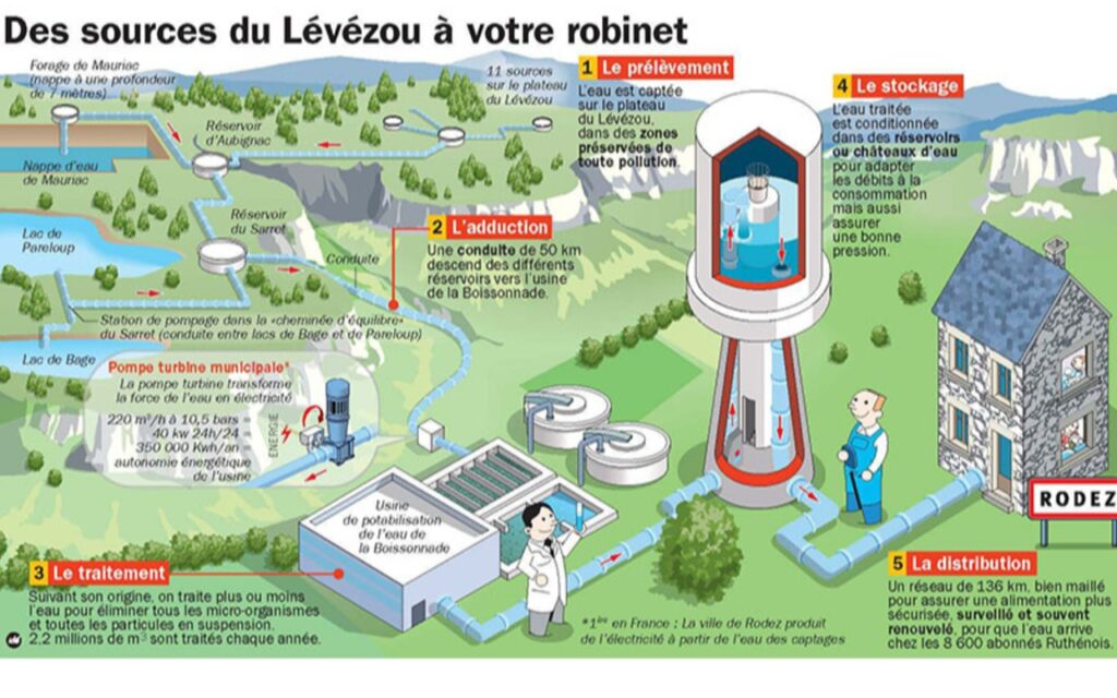 Depuis 2015, l’usine d’eau potable de Rodez produit autant d’électricité qu’elle en consomme. Pour cela, elle valorise l’énergie née de la vitesse de l’eau, captée 150 mètres plus haut. L’électricité produite est revendue à une coopérative et réinjectée dans le réseau électrique. L’innovation, simple techniquement, n’aurait, à ce jour, pas d’équivalent en France !