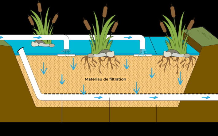 - Filtre à écoulement horizontal : Après le prétraitement vertical, l'eau passe horizontalement à travers un second lit de substrat saturé en eau. Ce processus permet une épuration supplémentaire grâce aux interactions bio-géochimiques entre les plantes, le substrat et les micro-organismes.