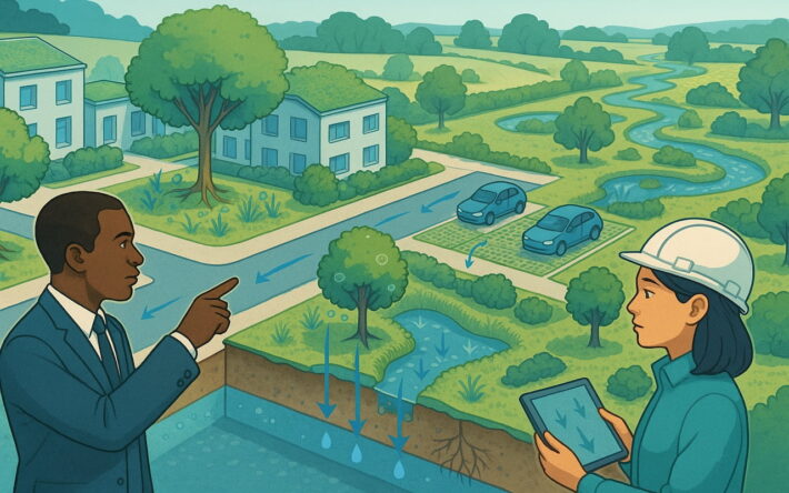La suppression des surfaces imperméabilisées constitue un prérequis. Parkings perméables, toitures végétalisées et voiries désimperméabilisées facilitent la recharge des nappes phréatiques.